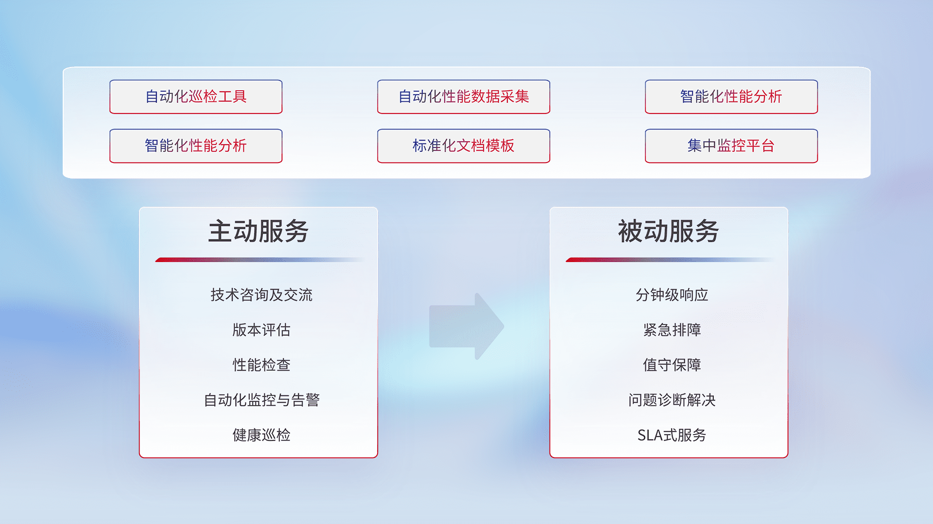 智能化工具和标准化文档,,,保障服务质量,,,,提供主动服务(包含技术咨询、、版本评估、、、性能检查、、自动化监控与告警、、、、健康巡检)和被动服务包含(分钟级响应、、、紧急排障、、值守保障、、、问题诊断解决、、SLA服务)。。。。
